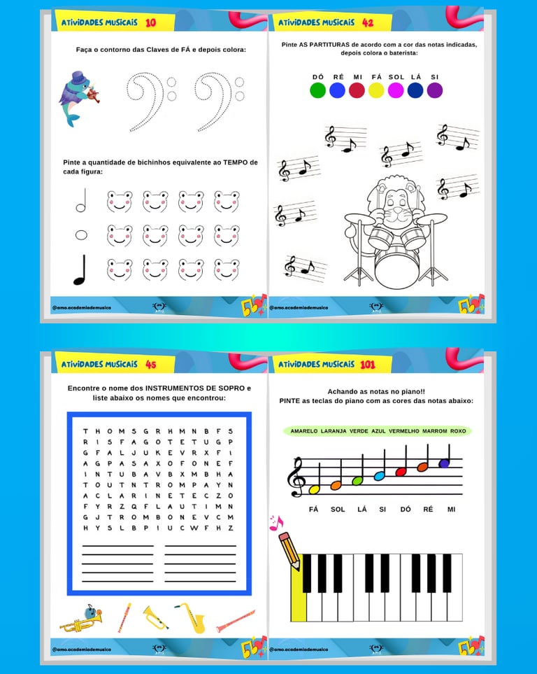 Ilustrações vibrantes, ATIVIDADES E EXERCÍCIOS DIVERSOS DE FIXAÇÃO, e MÚSICAS DE PARTITURA E CIFRAS PARA PRATICAR À VONTADE... as crianças serão apresentadas + 300 páginas com conceitos musicais essenciais, como: